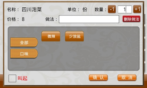 ·点击菜品名称或价格,进入点单编辑窗口,可以修改点单数量,并可选择做法