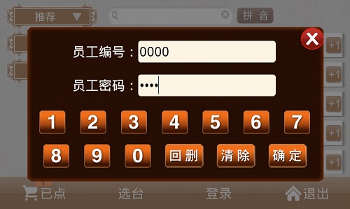 员工登录·在电子菜谱中点击“登录”,可以输入后台电脑系统中的员工编号和密码登录