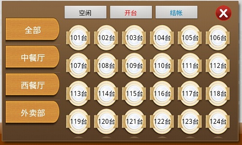 选台开台·点击电子菜谱上边的“选台”按钮,即可列出所有房台进行选择